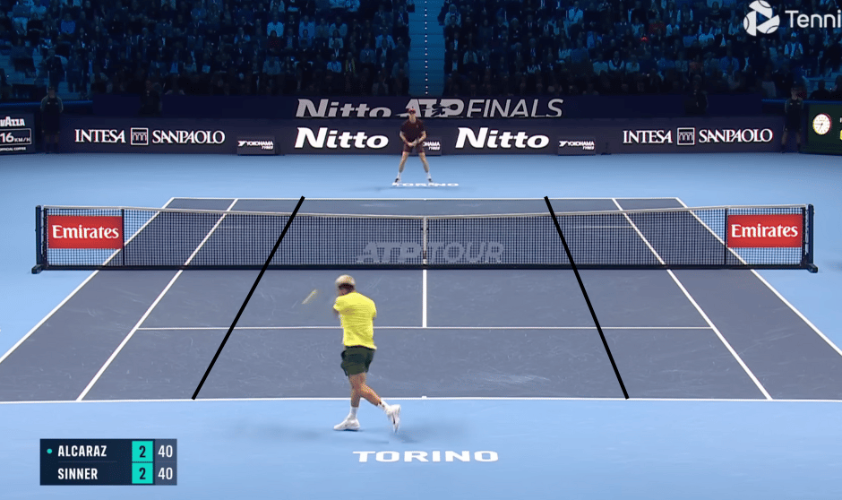 When you hit through the middle, you’re naturally hitting over the lower part of the net. That helps keep the ball down — which was ultimately what the Spaniard was after. He wanted to limit the number of shots Sinner could take in his strike zone.