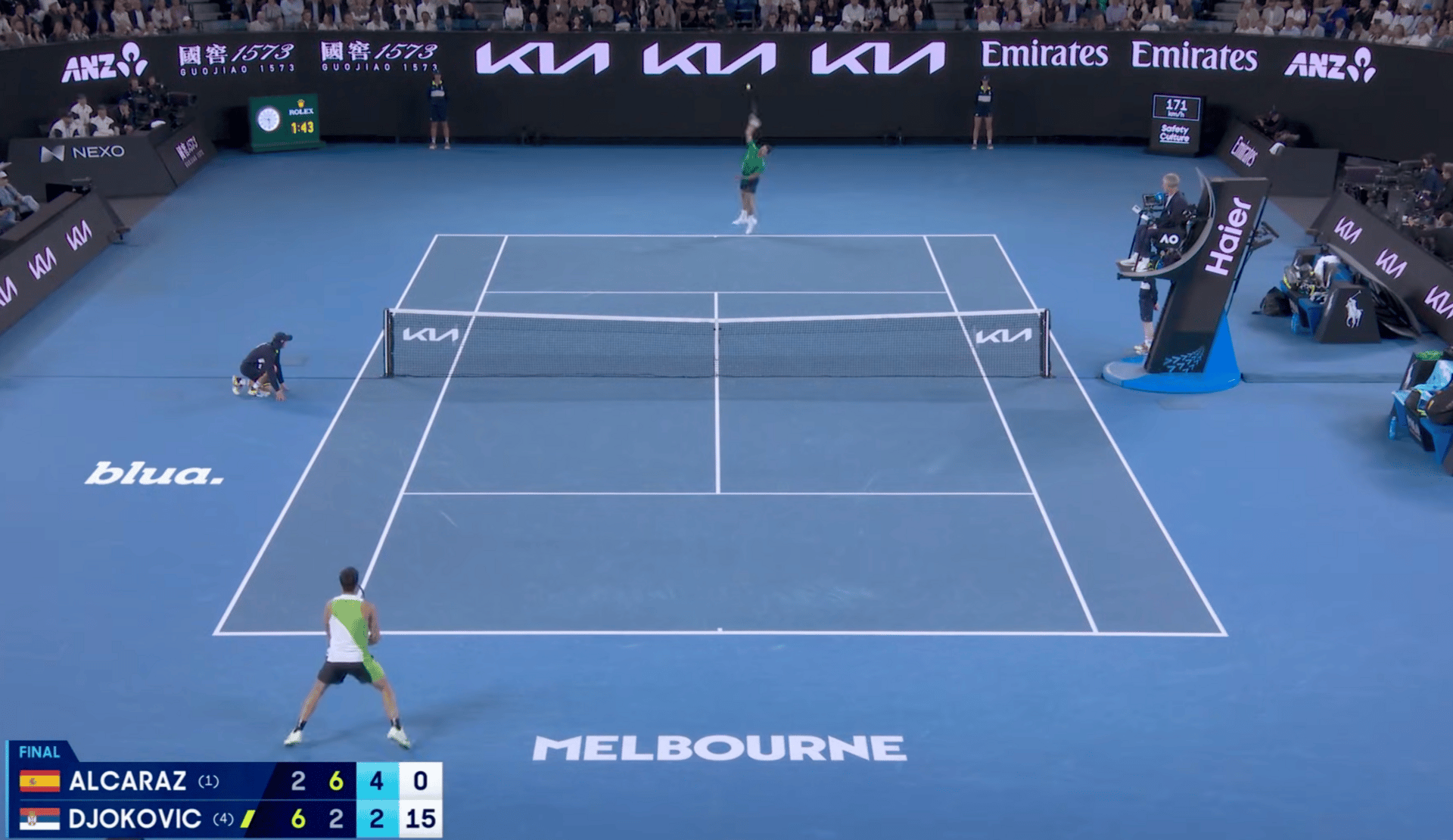 You could see it. The depth got shorter. His first serve dropped about 5mph. And when you give Carlos Alcaraz a slightly shorter, slightly slower ball, you’re basically handing him the remote control to the rally.