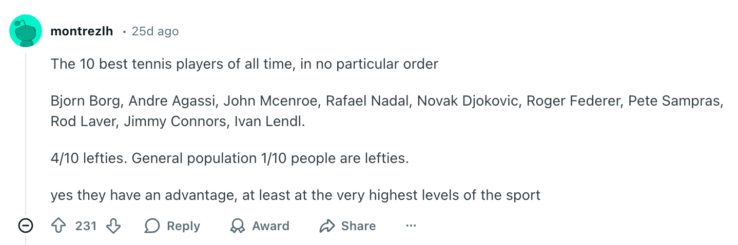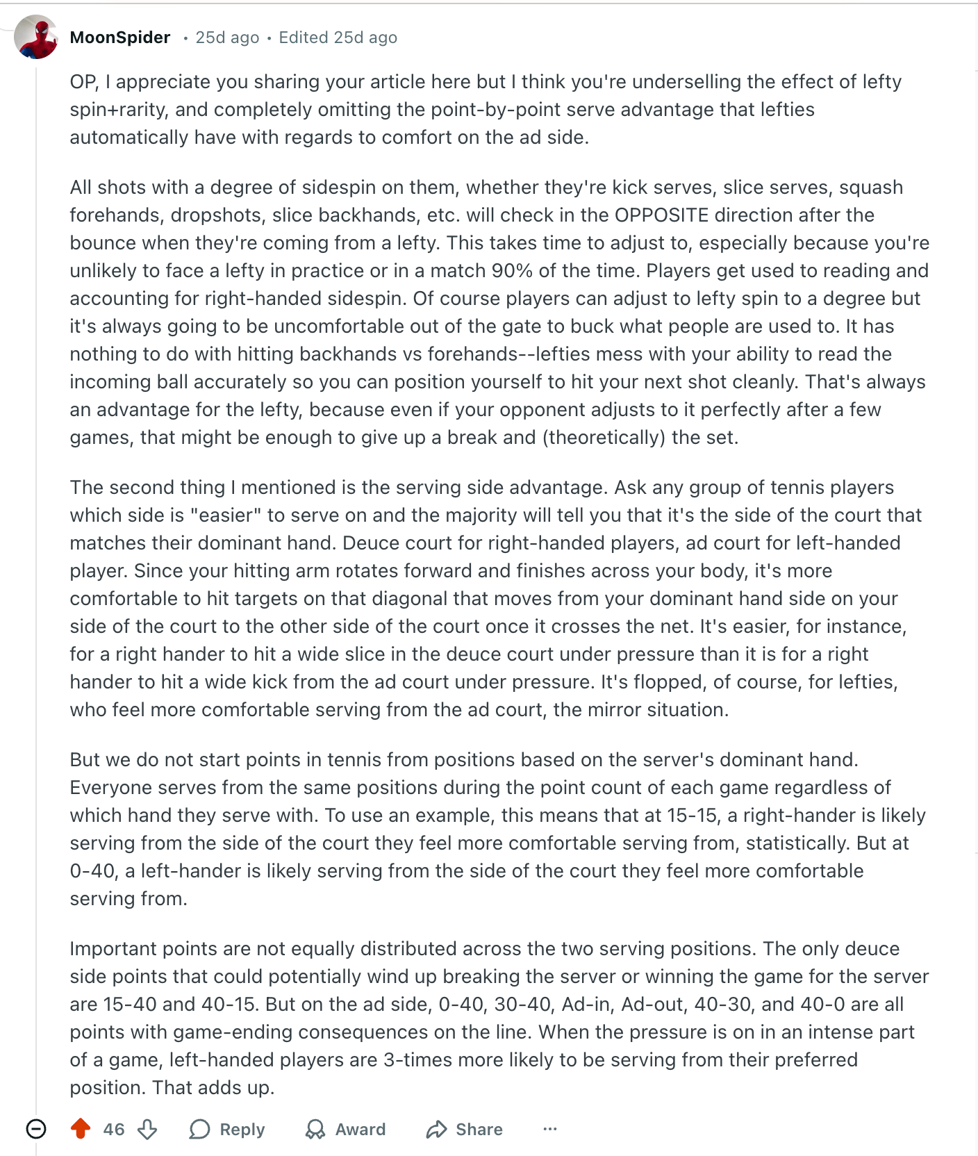 Many of you will remember, I wrote an edition answering the question, Do Lefties Have an Advantage? a few weeks ago. For those who might have missed it, my conclusion was no — it was just Nadal abusing Federer’s one-hander for two decades. Case closed. I felt great about the piece and my position.