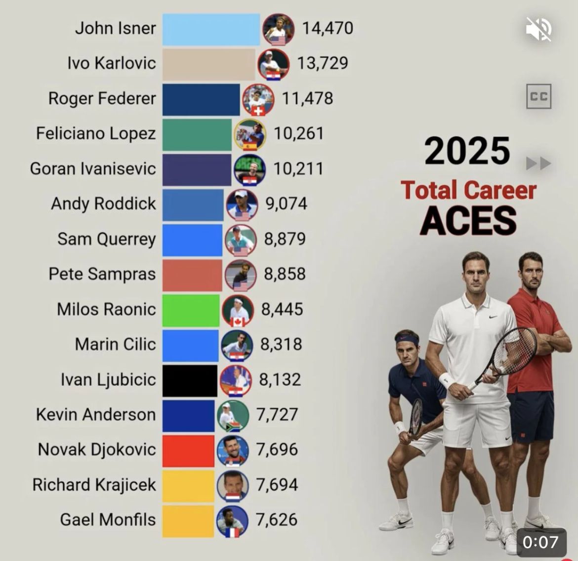 Federer is third on the all-time ace leader list? Since the rest of his game was so silky smooth, I think many of us overlooked just how great of a spot server he was.