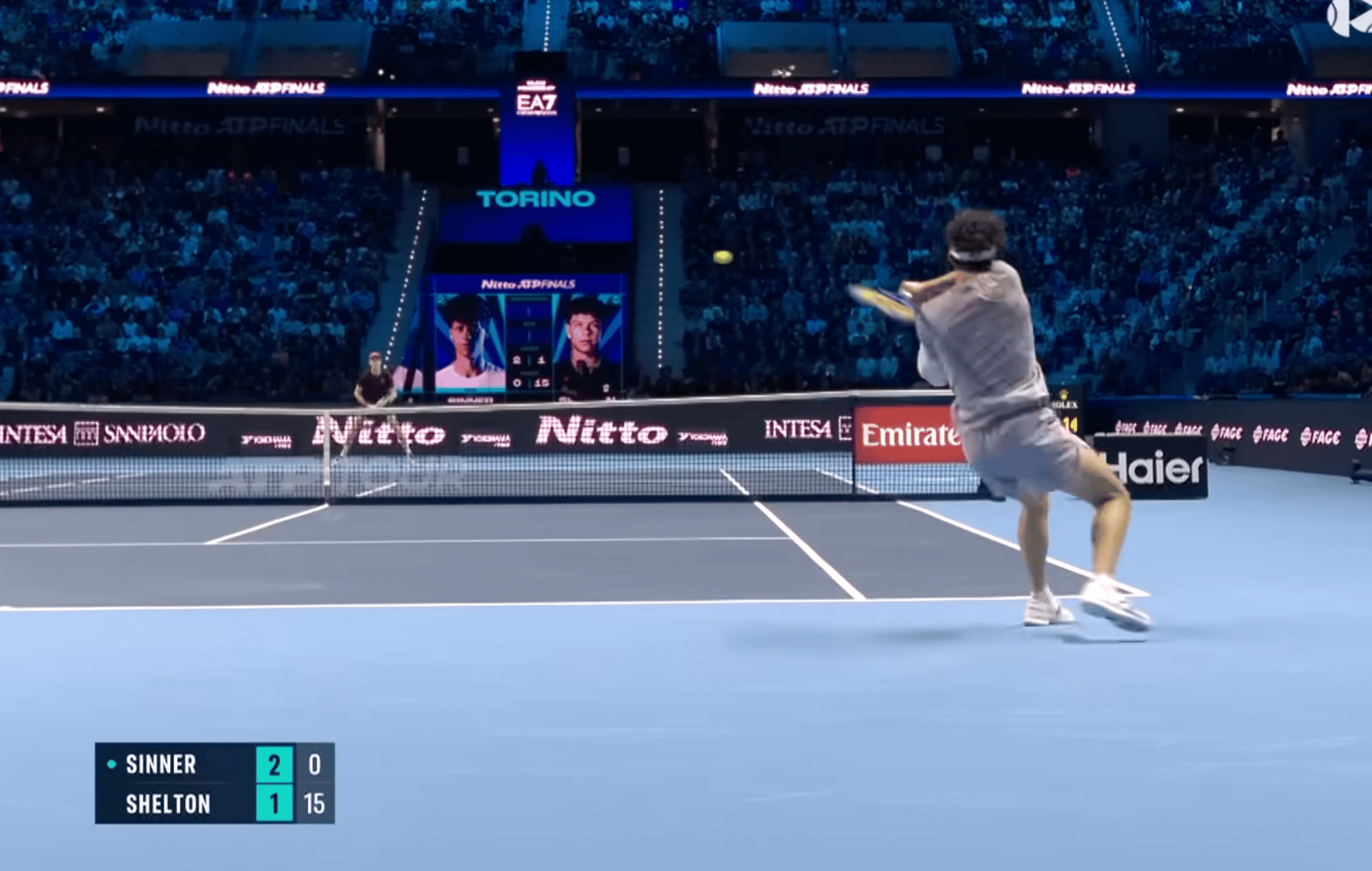 Shelton’s knees and hips are still facing to the right after contact, which means he didn’t get great rotation into the ball (YouTube/@TennisTV)