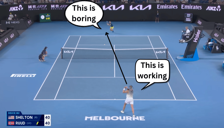 Most coaches will agree that Shelton’s backhand isn’t technically sound. When he’s stretched out wide on that side, he struggles to fully uncoil into the shot. The swing gets shorter. Which means he sort of just bunts it back.