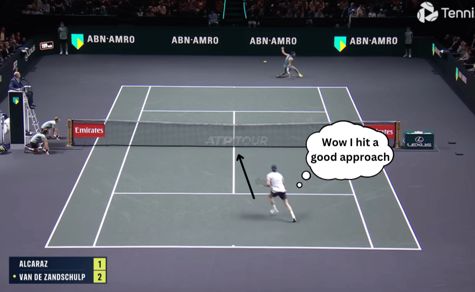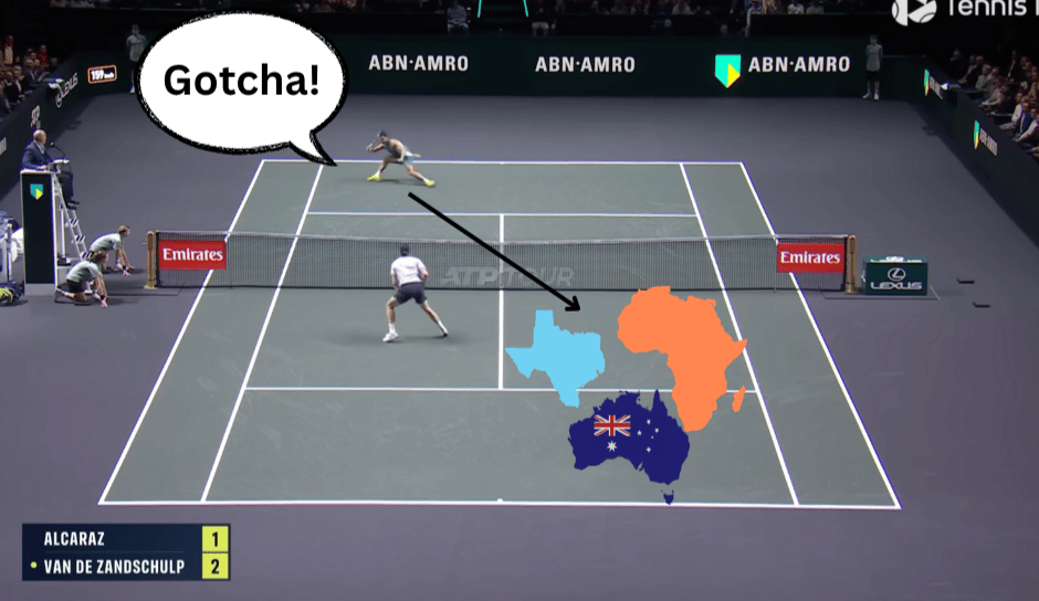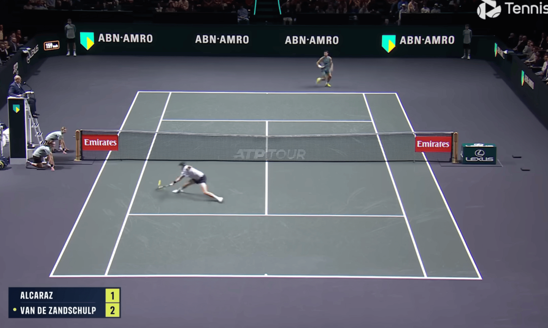 Here’s a common example. Carlos (it was easier to find one of his highlights) is sprinting to the backhand side, and his opponent is coming to the net.